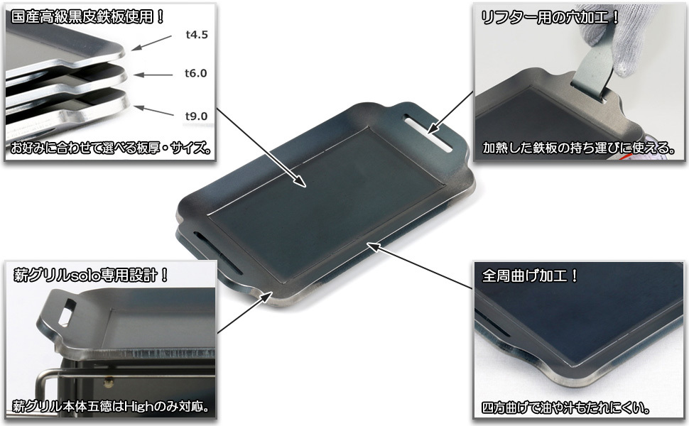 初めての方でも扱いやすい黒皮鉄板を使用し、通常の鉄よりも錆びにくい表面となります。使うほど鉄板に油が馴染んでいきますので繰り返しお使い頂くことで焼き上がりが良くなっていきます。板の厚みは4.5mm、6mm、9mmをラインナップし、予算や用途に合わせてお選び頂けます。