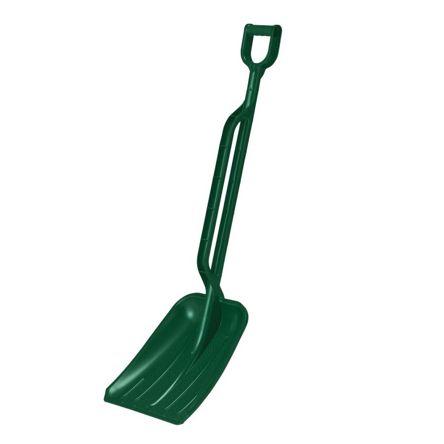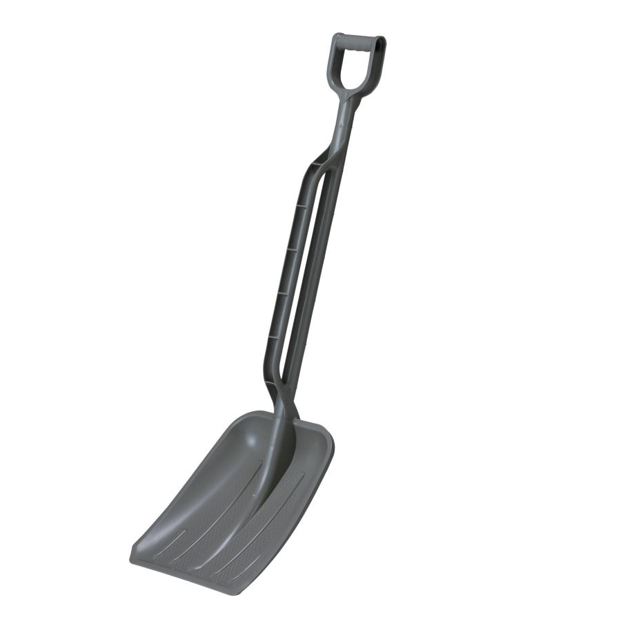 柄にもハンドルがついたダブルハンドルで、除雪や溜まった雨水の処理作業などが安定しておこなえます。樹脂製で軽く、強度のある一体成形品です。