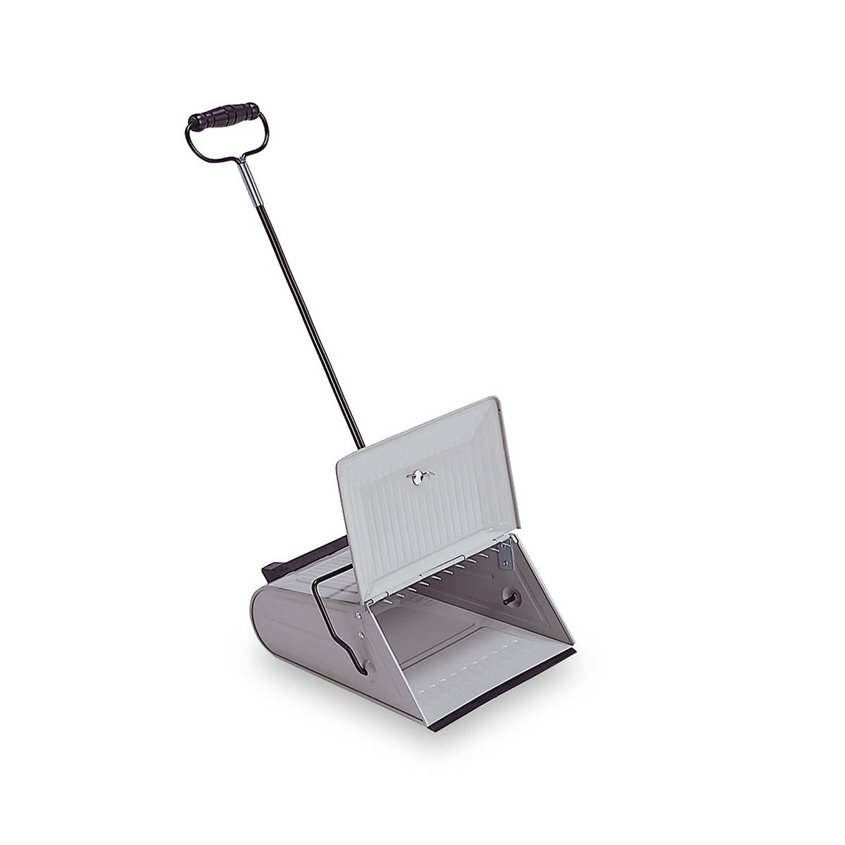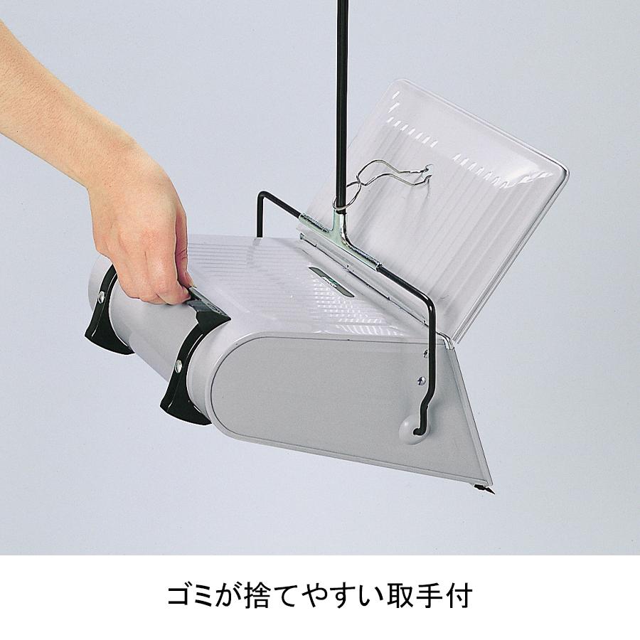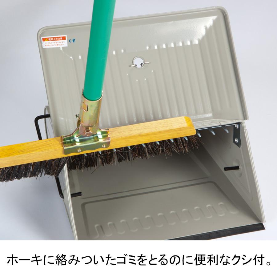 床面にフィットするゴムや、ホーキについたゴミを取るクシのついた、使いやすい自立タイプのチリトリ