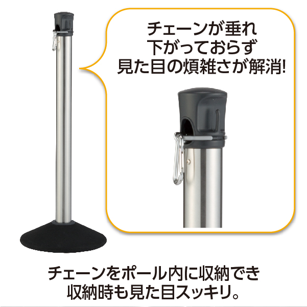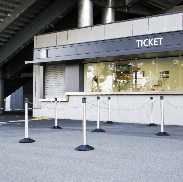 チェーン内蔵式で設置・撤収が効率的に行え、屋外の誘導・規制に使用できます。見た目もスタイリッシュで様々な施設にマッチします。