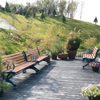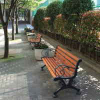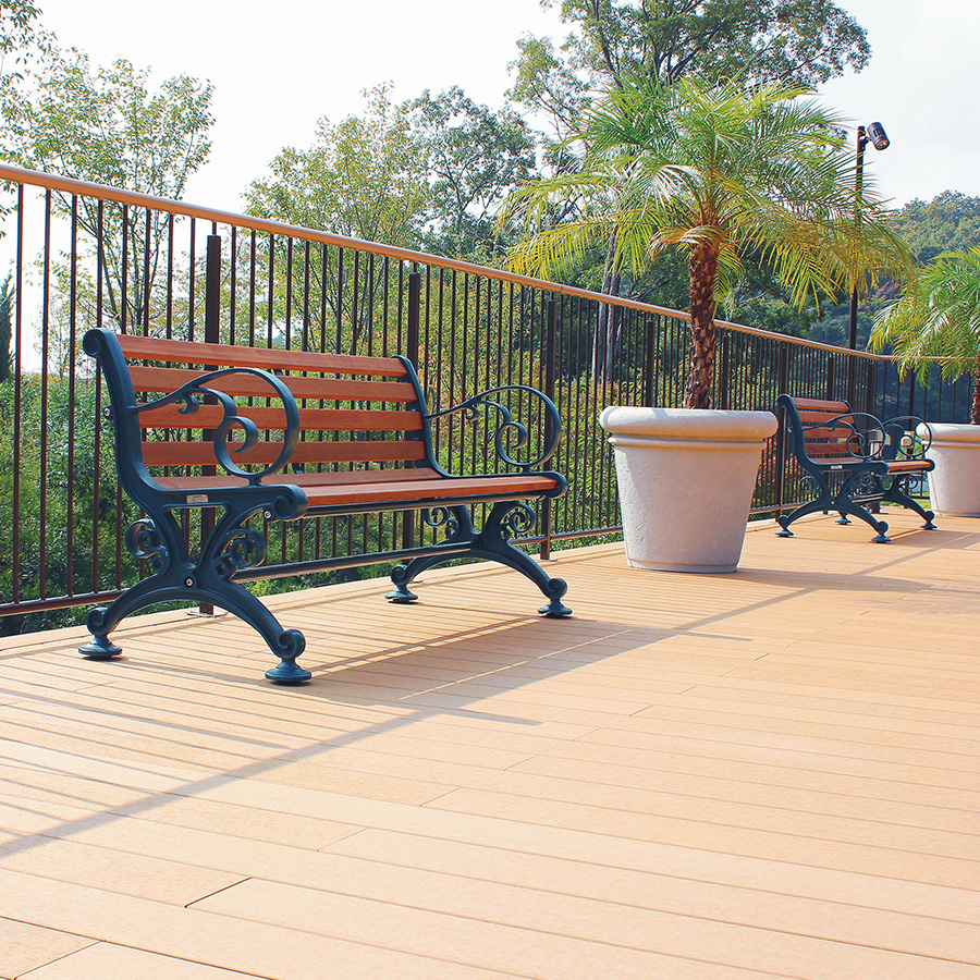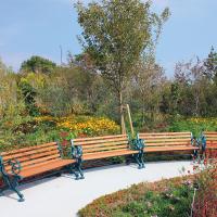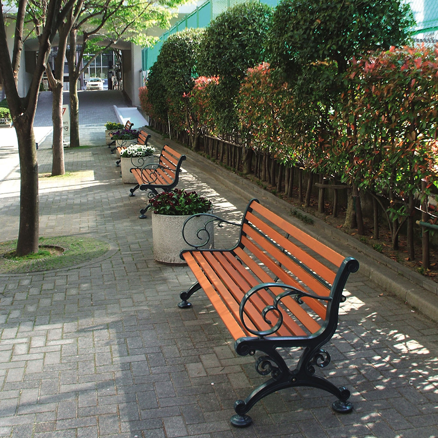 天然木を使用し、優しい雰囲気が魅力のベンチ。木材はネジ止めしていないので、雨水などにより腐食しにくい構造です。