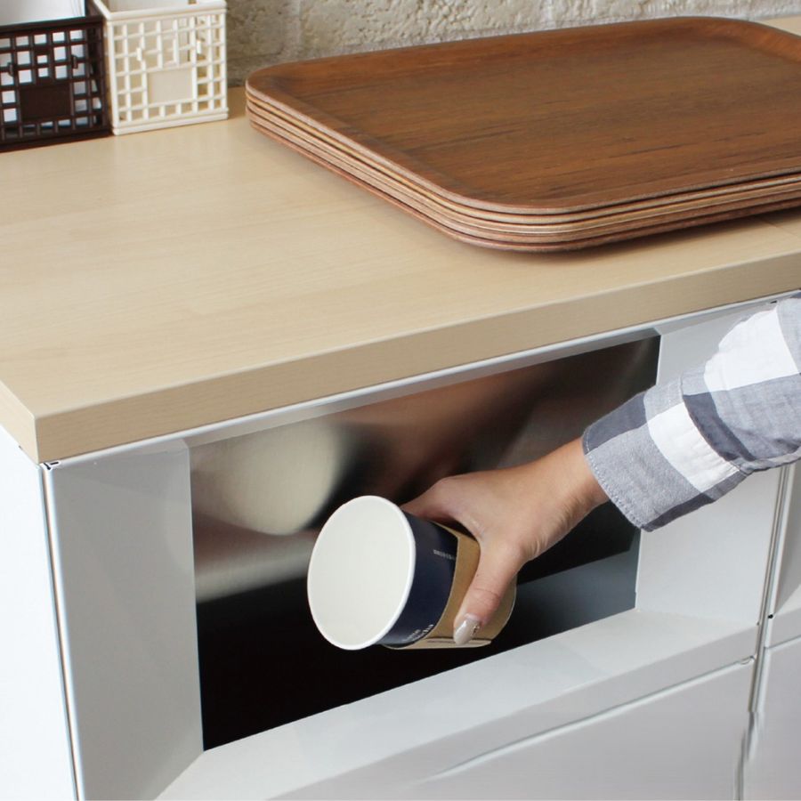 材質:本体:電気亜鉛メッキ鋼板に粉体塗装、天板:メラミン合板、中容器:ポリプロピレン(再生樹脂)