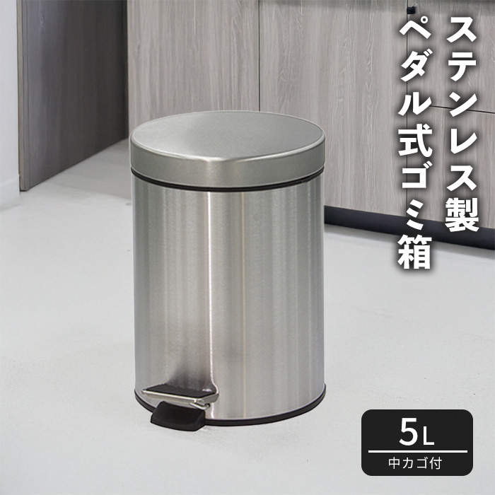 ステンレス素材の衛生的なペダル式ゴミ箱。