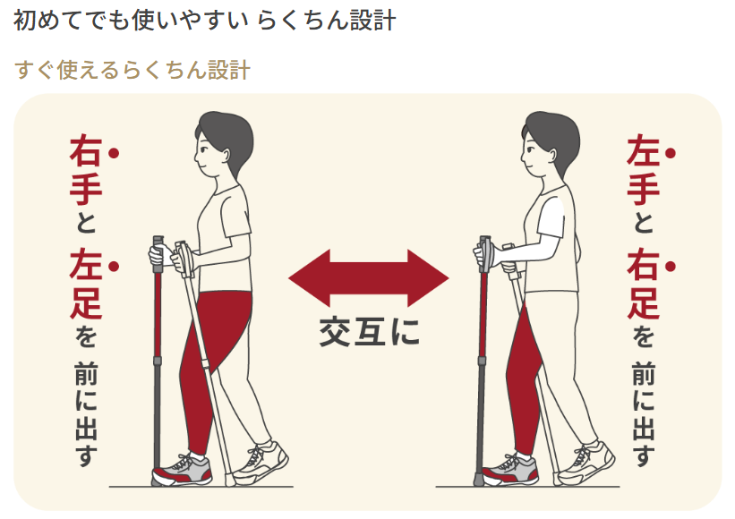 歩く動作に2本杖を両手に持つだけだから、特別な訓練は不要。どなたでも使用いただけます。右足を踏み出すときに左手を前に、1・2・1・2と歩いてみましょう。