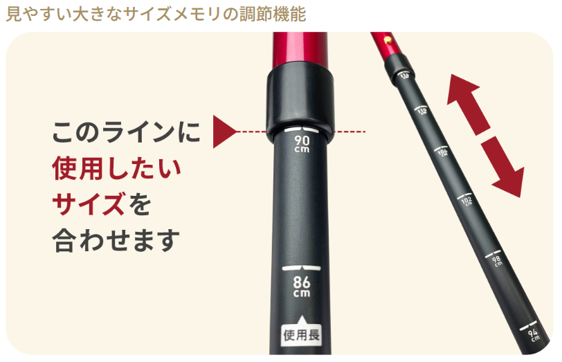 読みやすい大きな字のサイズメモリ表記。 体格に合わせてご使用いただけるように長さ調節が可能です。