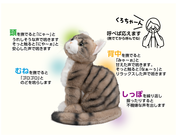 なでなでねこちゃんシリーズは、猫を飼いたくても飼えない方に向けて、本当の猫と一緒に暮らす幸せを感じていただくために生まれた猫の代理ロボットです。