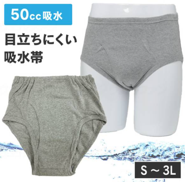 トイレに間に合わなかった時のちょいモレをサッと吸水する、日常生活や年齢によるのちょこっと尿漏れを気にせずに過ごしたい、アクティブシニアにお勧めの男性用の50cc吸水層付きブリーフです。