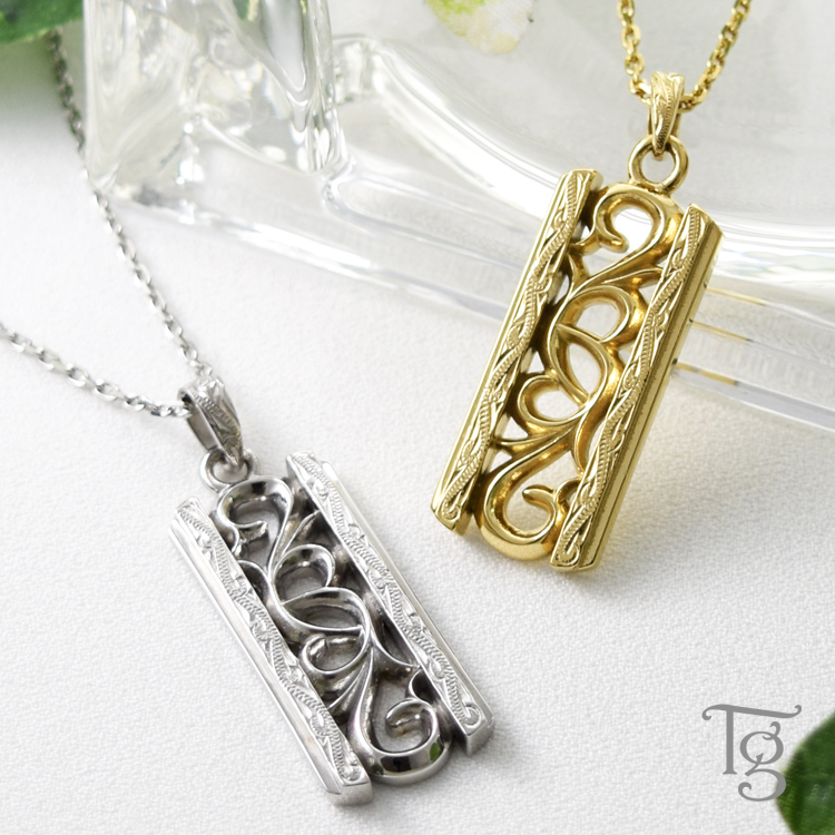 ■ 商品説明プレートタイプのペンダントトップにアラベスクデザインと繊細なハワイアン柄を施したペアネックレス。男性用はスティールシルバーカラー、女性用はイエローゴールドカラーの仕様です。