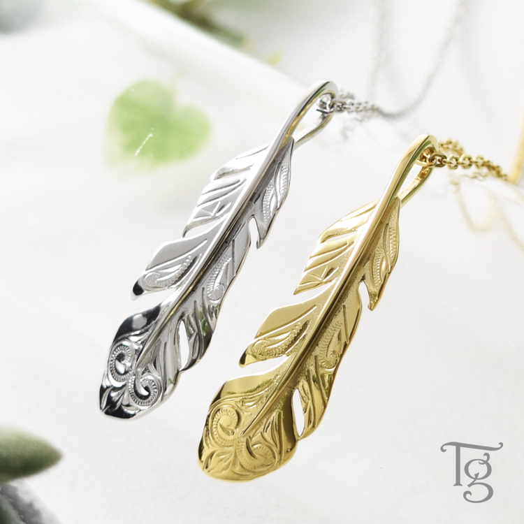 ■ 商品説明フェザーデザインに繊細なハワイアン柄を施したペアネックレス。男性用はスティールシルバーカラー、女性用はイエローゴールドカラーの仕様です。