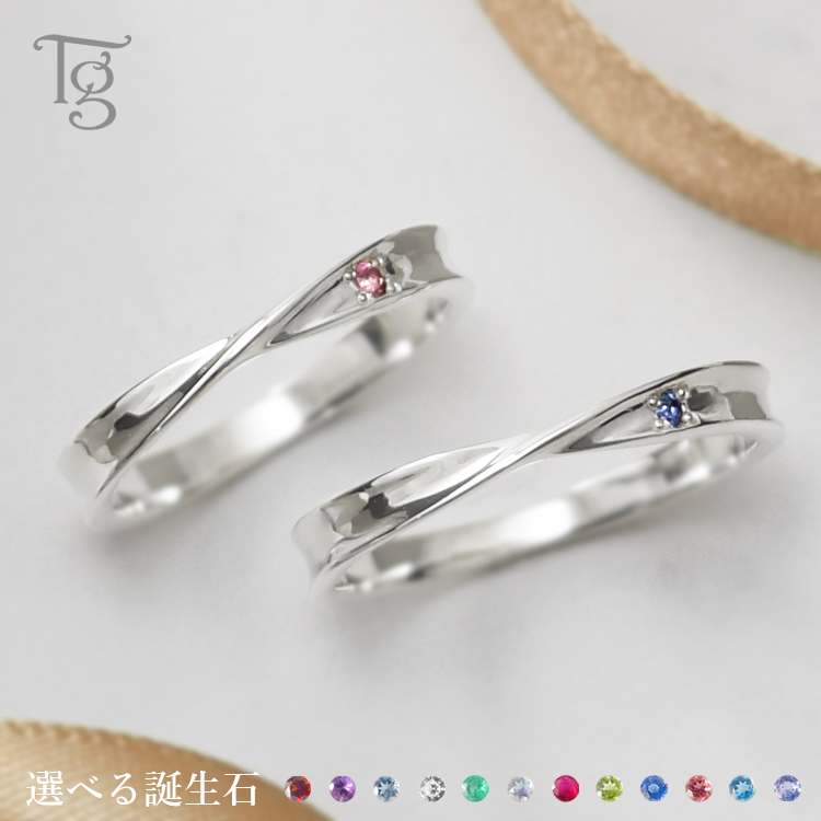 誕生石が選べる二人だけの特別なペアリング。細身のひねりデザインが指をキレイに見せてくれるメビウスデザイン。リング内側に名前や記念日などが刻印可能です。