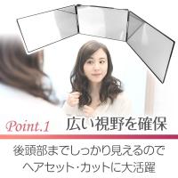 鏡の大きさはA4サイズ程度で三面の鏡で顔正面だけではなく、横顔や顔全体、後頭部を確認できます。