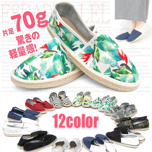 【エスパドリーユ レディース シューズ 靴 スーパーライト 超軽量 EVAソール スリッポン フラットシューズ ペタンコ カラバリ豊富 エスパドリーユライト ボタニカル パームツリー ボーダー カモフラージュ シルバー 無地 柄物 バイカラー】