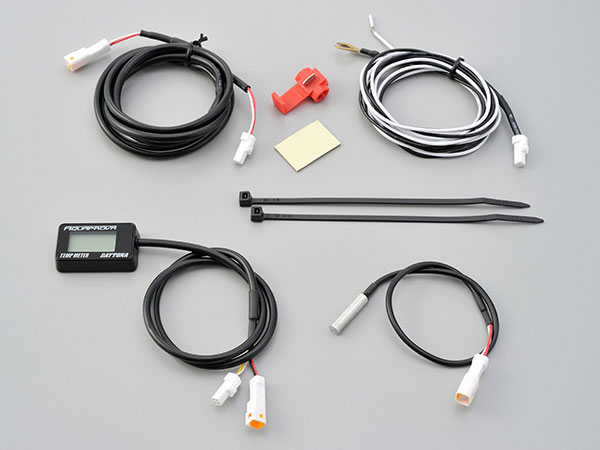●本体から出ている電源ハーネスの先に、温度センサーが取り付けられている外部センサー式の温度計。イグニションキーに連動して電源のON/OFFが可能。バックライト照明付き。測定温度範囲−9℃〜150℃。5℃未満でバックライトが赤色に切り替わる寒冷アラート機能付き。外気温はもちろん、エアクリーナーボックスやバッテリー周辺などの温度計測も可能です。別売のテンプセンサー(72816/93062)とセンサーフィッティングを使用することで油温計としても使用可能。120℃以上でバックライトが赤色に切り替わる警告アラート機能も搭載しています。電源ハーネス長:1500mm 両面テープ:(30×20mm)付属。