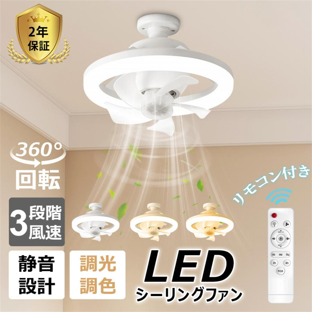 シーリングファンライト E26口金 首振り LEDライトLED ファン付き照明 シーリングライト LED電球 サーキュレーター シーリングファン 大風量 扇風機 調色調光
