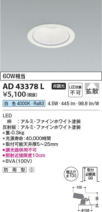 AD43378L コイズミ照明 FineWhite ダウンライト [LED白色][ファインホワイト]