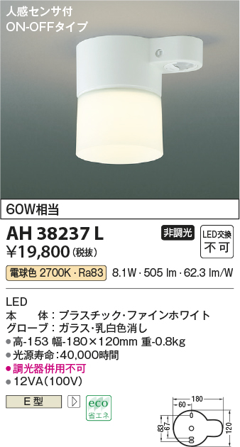 在庫品 AH38237L コイズミ照明 人感センサ付 FineWhite 小型シーリングライト [LED電球色][60W相当][ON-OFFタイプ][ファインホワイト][ガラス・乳白色消し]