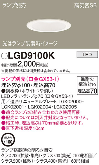 在庫品 LGD9100K パナソニック 埋込穴φ100 天井埋込型 LED ダウンライト 浅型7H・高気密SB形 [ランプ別売GX53] [枠 ホワイトつや消し]