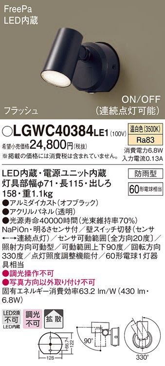 在庫品 LGWC40384LE1 パナソニック 屋外用LEDスポットライト [FreePa][フラッシュ][ON/OFF形][連続点灯][温白色][防雨型][60形電球][ブラック][明るさセンサ付]