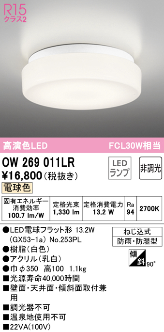 在庫品 OW269011LR オーデリック LED軒下灯[高演色][FCL30W相当][電球色][防雨・防湿型][樹脂白色][アクリル乳白][壁面・天井・傾斜面取付兼用]