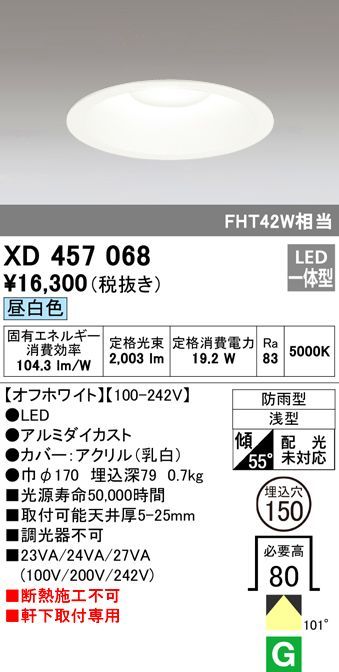 XD457068 オーデリック エクステリアLED ダウンライト [FHT42W相当][昼白色][防雨型][傾斜天井対応][φ150]