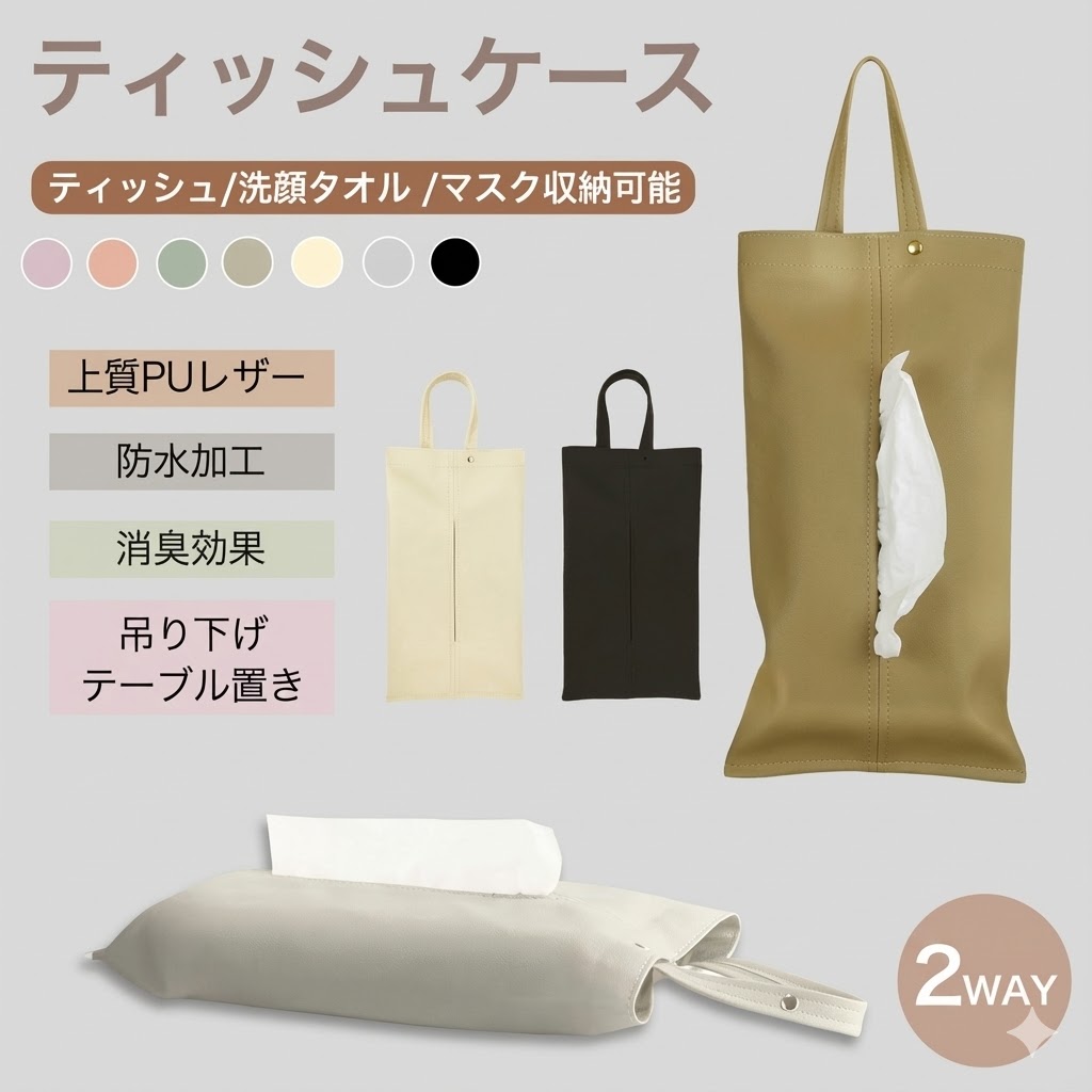 | Q1: このティッシュケースは本革ですか? A1: いいえ、本革ではありませんが、高品質な合皮素材を採用しているため、本革のような質感と美しい見た目を持っています。また、耐久性にも優れており、長くご使用いただけます。 Q2: このティッシュケースはどのように設置できますか? A2: 吊り下げ式のデザインで、取っ手部分は2段階で長さ調節が可能です。車内やベビーカー、玄関など、フックに掛けることで簡単に設置できます。限られたスペースでも便利に使用可能です。 Q3: このケースにはティッシュ以外に何が収納できますか? A3: ティッシュだけでなく、キッチンペーパーやマスクなども収納可能です。玄関に吊るしておけば、外出時にマスクを忘れる心配がありません。 Q4: このティッシュケースは水回りで使っても大丈夫ですか? A4: はい、水をはじく素材を使用しているため、洗面所やキッチンなどの水回りでも安心してご使用いただけます。汚れた場合もサッと拭くだけで綺麗に保てます。 Q5: このティッシュケースは部屋のインテリアに合いますか? A5: はい、生活感をすっきり隠すデザインなので、インテリアとしても優れた存在感を発揮します。お部屋の雰囲気を損なわず、洗練されたデザインが特徴です。 | ||||||