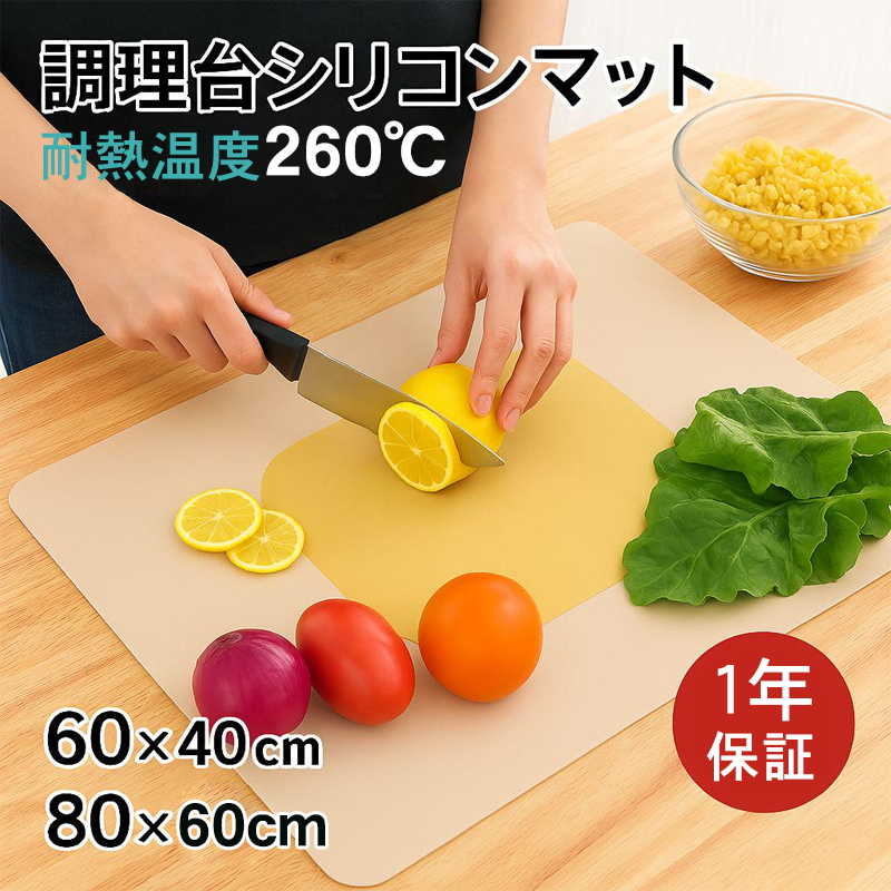 シリコン素材で作られたこのキッチンマットは、熱・水・キズ・汚れから調理台をしっかり守る頼れる存在。80×60cm/40×60cmの大判サイズで、作業スペースを広々確保しながら、滑り止め効果で快適に料理ができます。