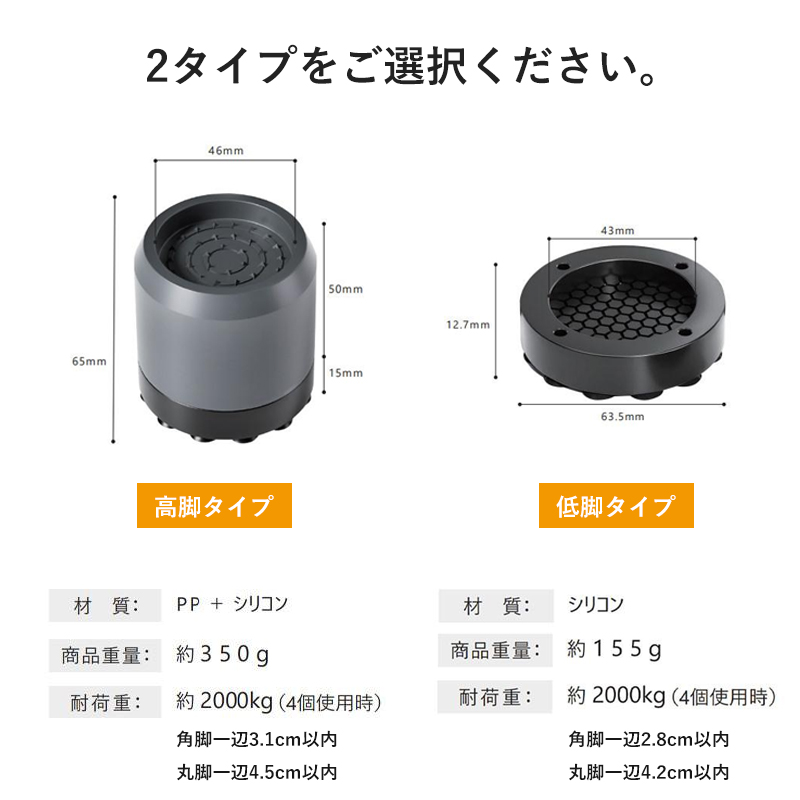 材質:シリコン(矮脚タイプ)、PP+シリコン(高脚タイプ)