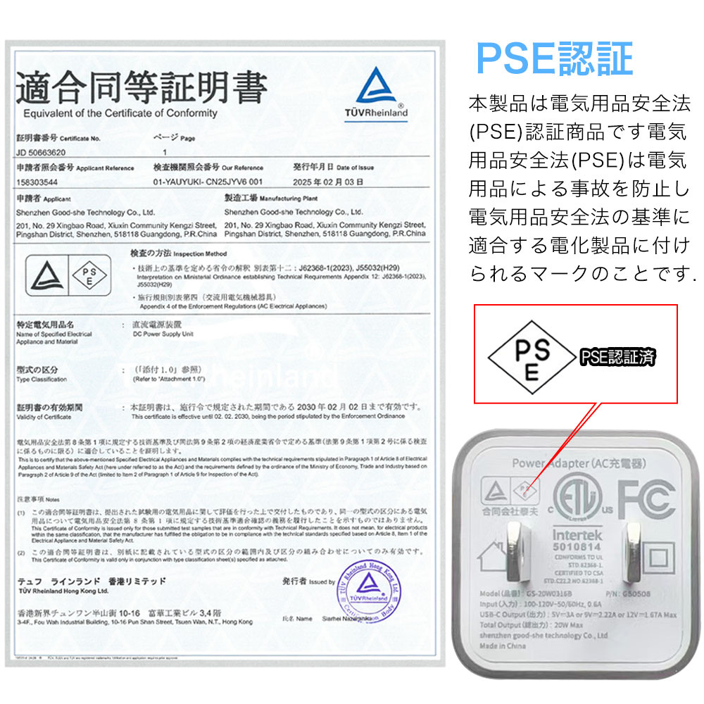 PSE認証取得済みで安心してお使いいただけます。