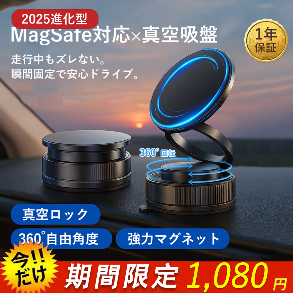 スマホホルダー 車 携帯ホルダー MagSafe 真空吸盤 強力吸着 N55磁石 360°回転 片手操作 車載ホルダー 車用スマホホルダー カー用品 iPhone Android