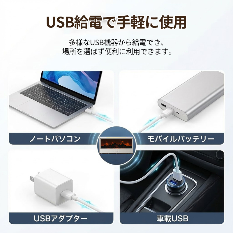 USB充電に対応しているため、どこでも手軽に充電できます。アウトドアやオフィスでも使用しやすく、常に充電状態を保つことができます。さらに、静音設計で、動作音がほとんど気にならず、寝室やオフィスでも快適に使用できます。