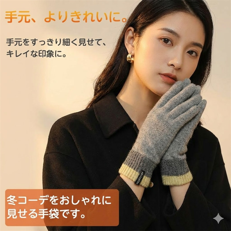 手元がすっきり見えるスリムデザインで、指のラインをきれいに演出。冬コーデを上品に引き立て、手を細く長く見せてくれる美シルエットの手袋です。