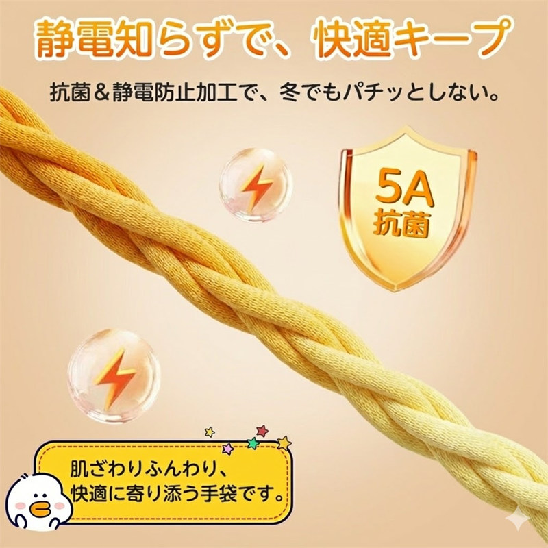 静電気が起きにくい加工で冬でもパチッとしにくく快適。さらに抗菌仕様で清潔に保てるため、毎日安心して使える高機能デイリー手袋として活躍します。