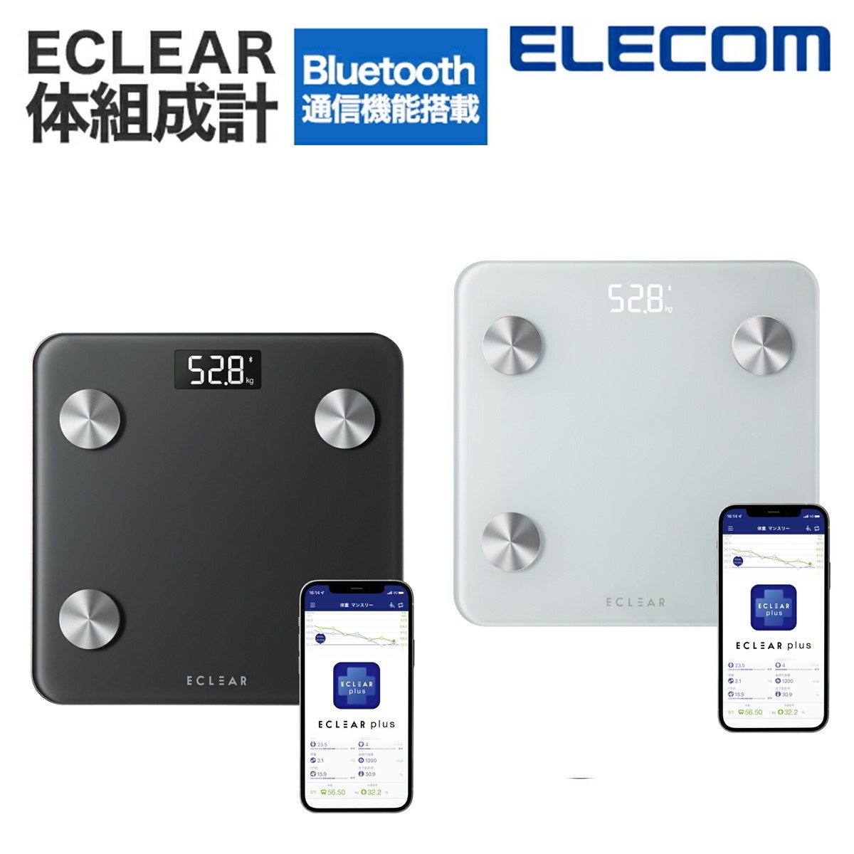 ■測定データを専用アプリ「ECLEAR plus」(エクリア プラス)に転送できる、Bluetooth通信機能搭載“エクリア 体組成計”です。