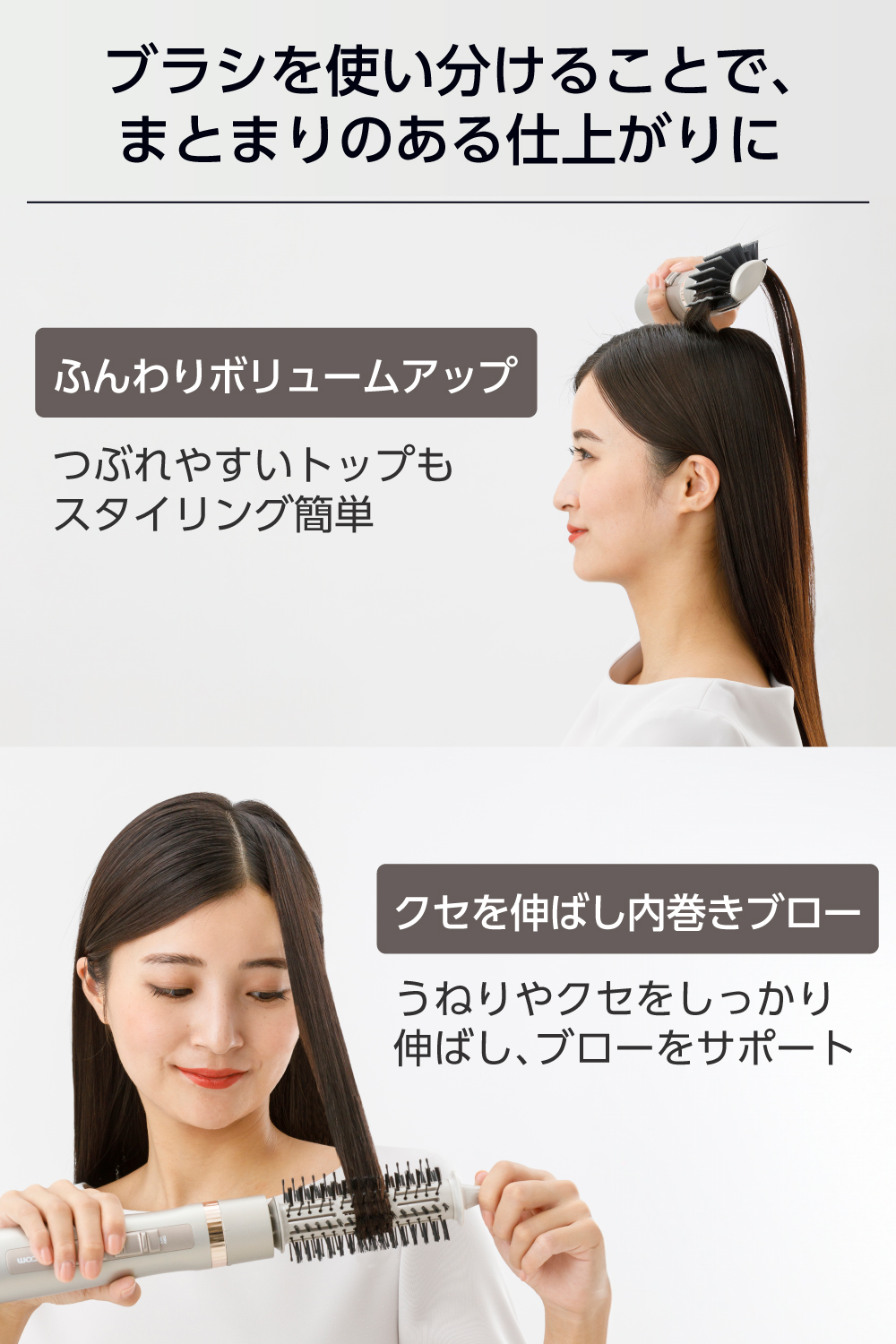 ■幅広のワイドキャッチブラシと、ピンと植毛が360度に配されたロールブローブラシが付属。ブラシを使い分けることで、ボリュームアップさせたヘアスタイルや、クセを伸ばし髪を整えるブローのニーズに応えます。