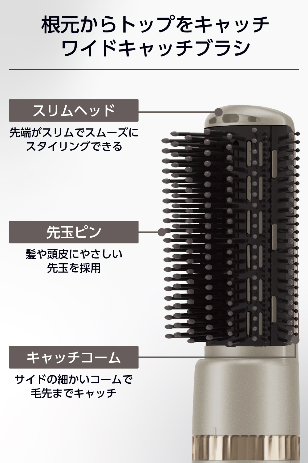 ■幅広ブラシが髪の根元をしっかりキャッチし、トップをふんわり立ち上げたり、ブラシのサイドに配したキャッチコームが毛先まで逃さず、まとまりのある仕上がりへとサポートします。ピンには髪や頭皮に優しい先玉を採用、またブラシの先端はスリムで髪の間に入りやすく、使いやすさを考慮しました。