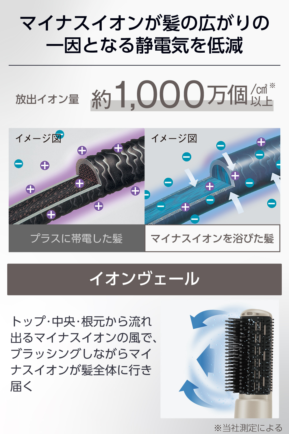 ■ブラッシングしながらマイナスイオン※が髪全体に行き届き、髪の広がりの一因となる静電気を低減します。※放出イオン量 約1,000万個/cm3以上 / 当社測定法/当社比較検証法による