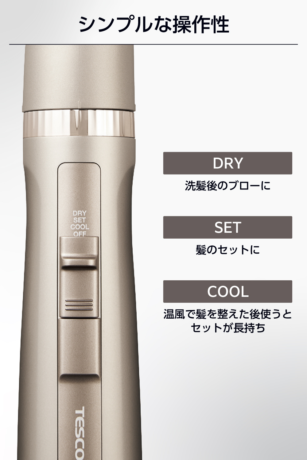 ■操作しやすい3段階の切替スイッチは、「DRY」モードで地肌からしっかり乾かし、髪が広がりにくい風量の「SET」モードでスタイリングを。「COOL」モードで冷風に。「DRY」、「SET」モードは温風2段階の調節が可能です。