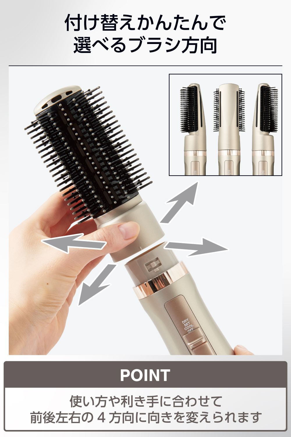 ■使い方や利き手に合わせて前後左右の4方向にブラシの向きを変えられます。差し込んで回すだけで簡単に着脱できる回転ロック式を採用しました。
