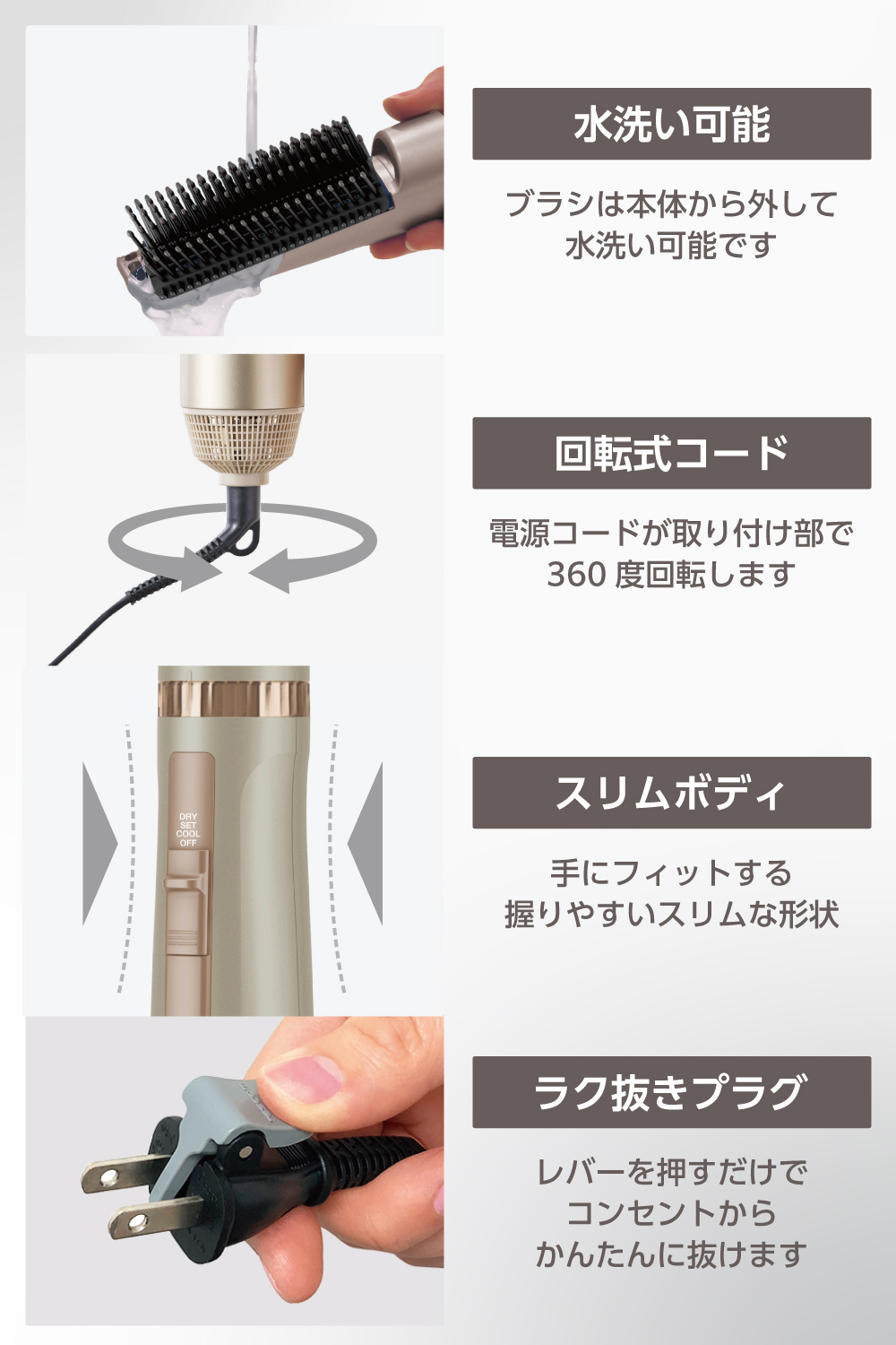 ■〈回転式コード〉電源コードが本体取り付け部で360度回転。コード自体もねじれにくいので使いやすいです。〈ラク抜きプラグ〉レバーを押すだけでコンセントから簡単に抜けます。