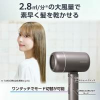 ■マイナスイオンとプラスイオンを同時に放出し、それぞれのイオン(※)が髪に働いて、髪の広がりや傷みの一因となる静電気を抑制します。また、髪のツヤもアップします。 ※放出イオン量約1,000万個/cm3以上 当社測定法/当社比較検証法による