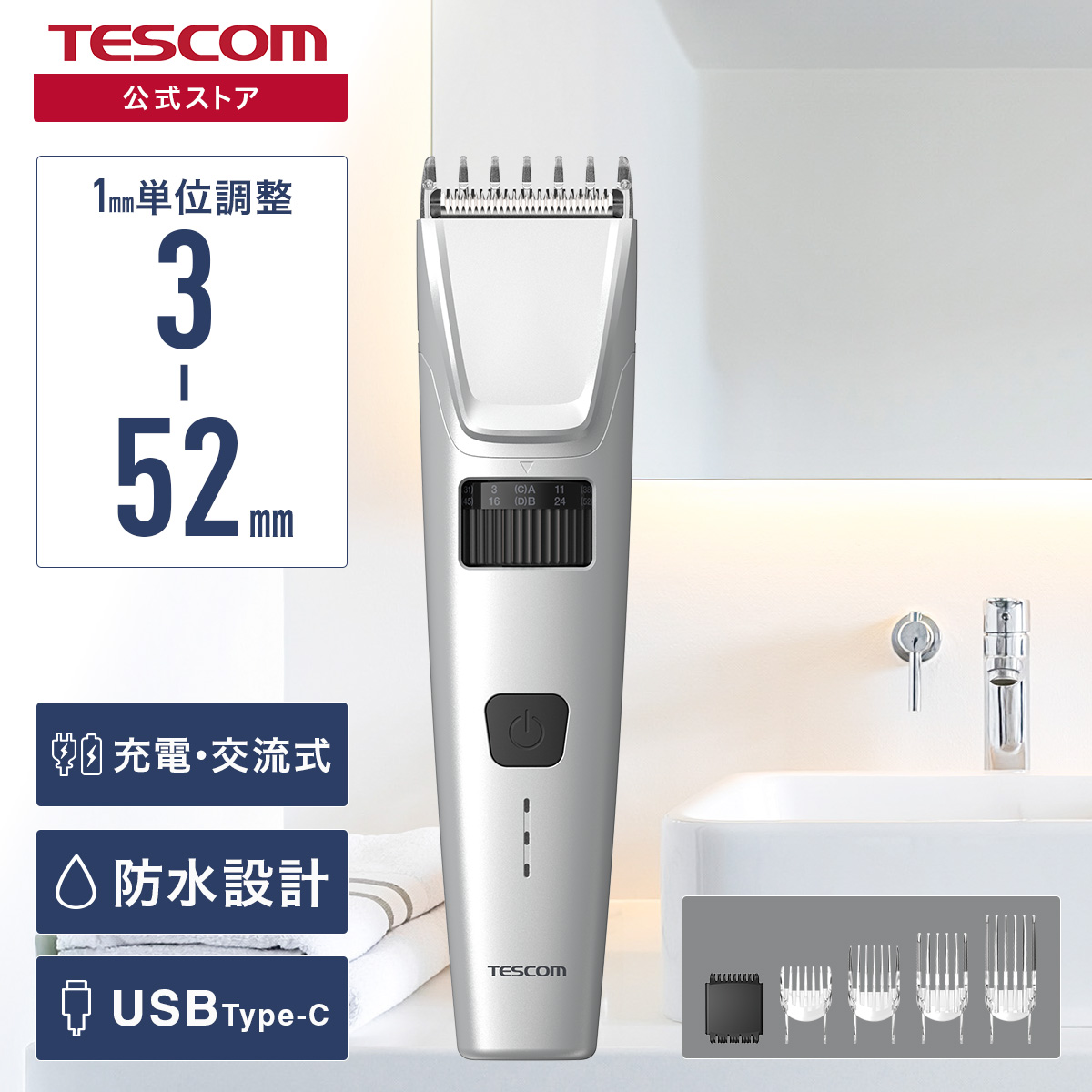 ■付属品:コーム4種(刈り高さ3mm-11mm/16mm-24mm/30mm-38mm/44mm-52mm)、電源ケーブル(USB Type-C(TM) - USB Type-C)、掃除用ブラシ、TESCOMオイル、収納ポーチ