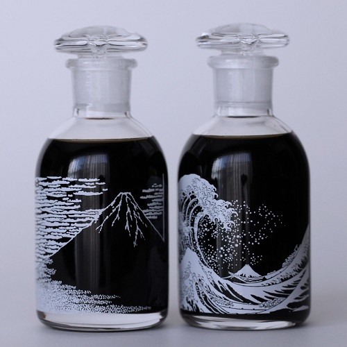 液だれしない醤油さしは、本体に柄のない定番タイプや「富士山と桜」の模様をお入れしたもの、葛飾北斎の「富嶽三十六景」をプリントしたものなど、数種類ご用意いたしました。