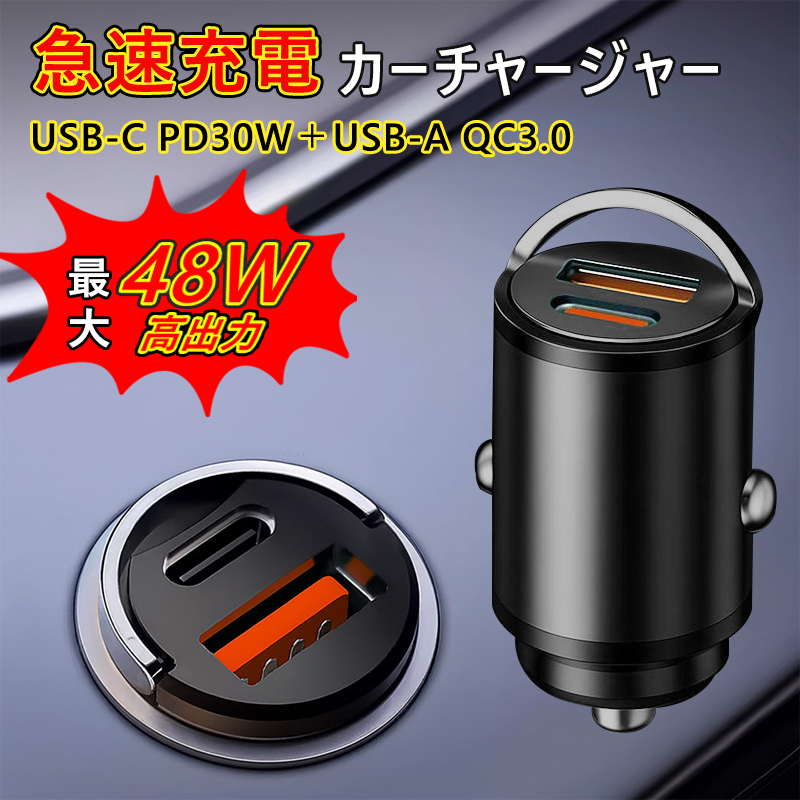 シガーソケット カーチャージャー 急速充電 PD30W 2ポート 車載充電器 ミニ USB-A TYPE-C 増設ソケット iPhone アンドロイド 12V/24V車対応