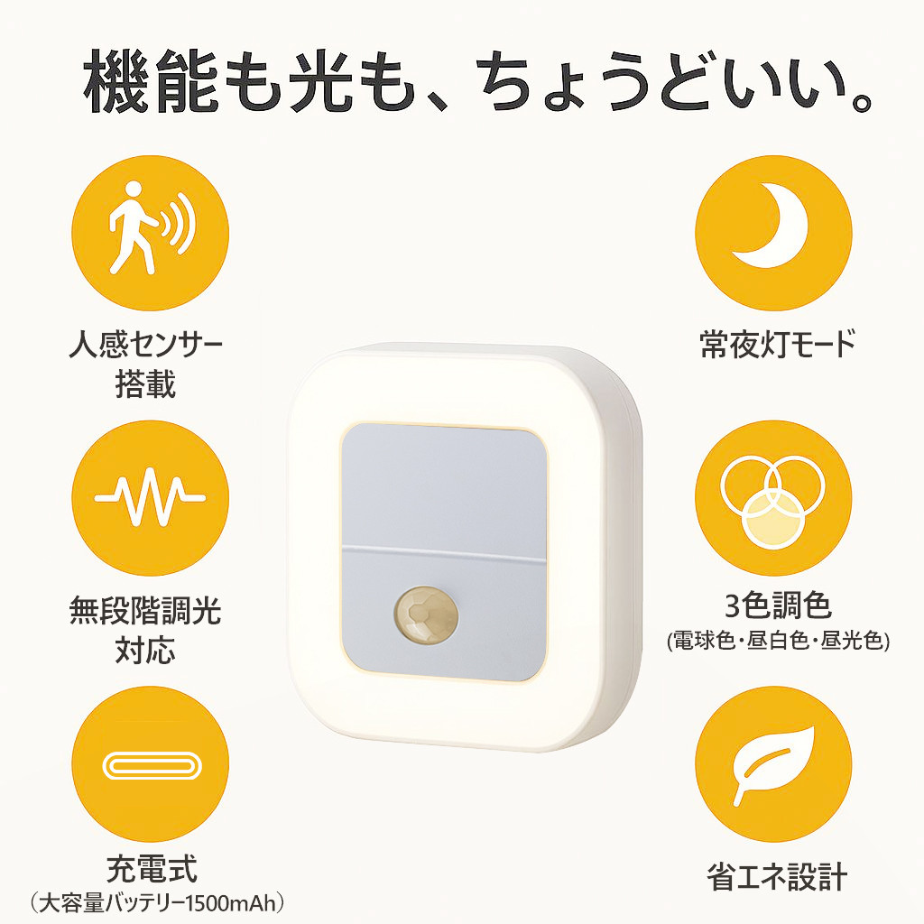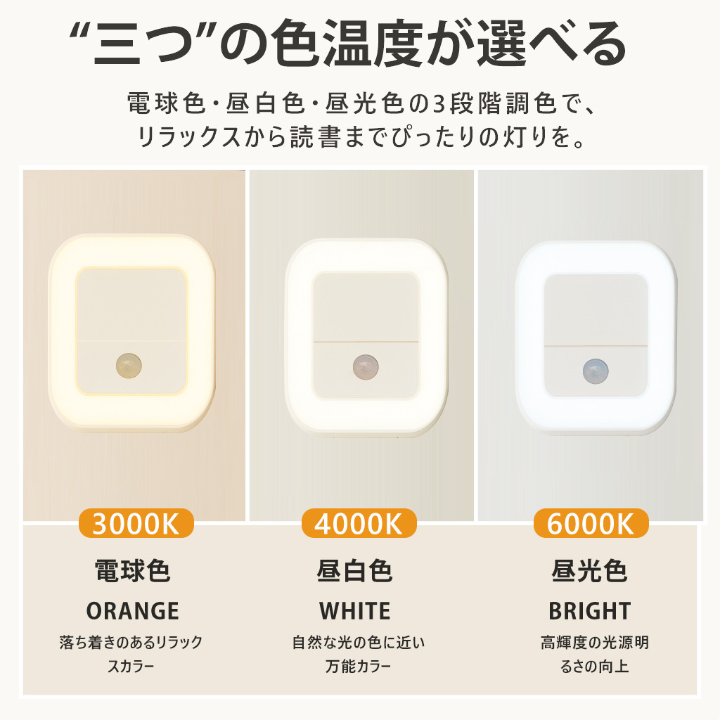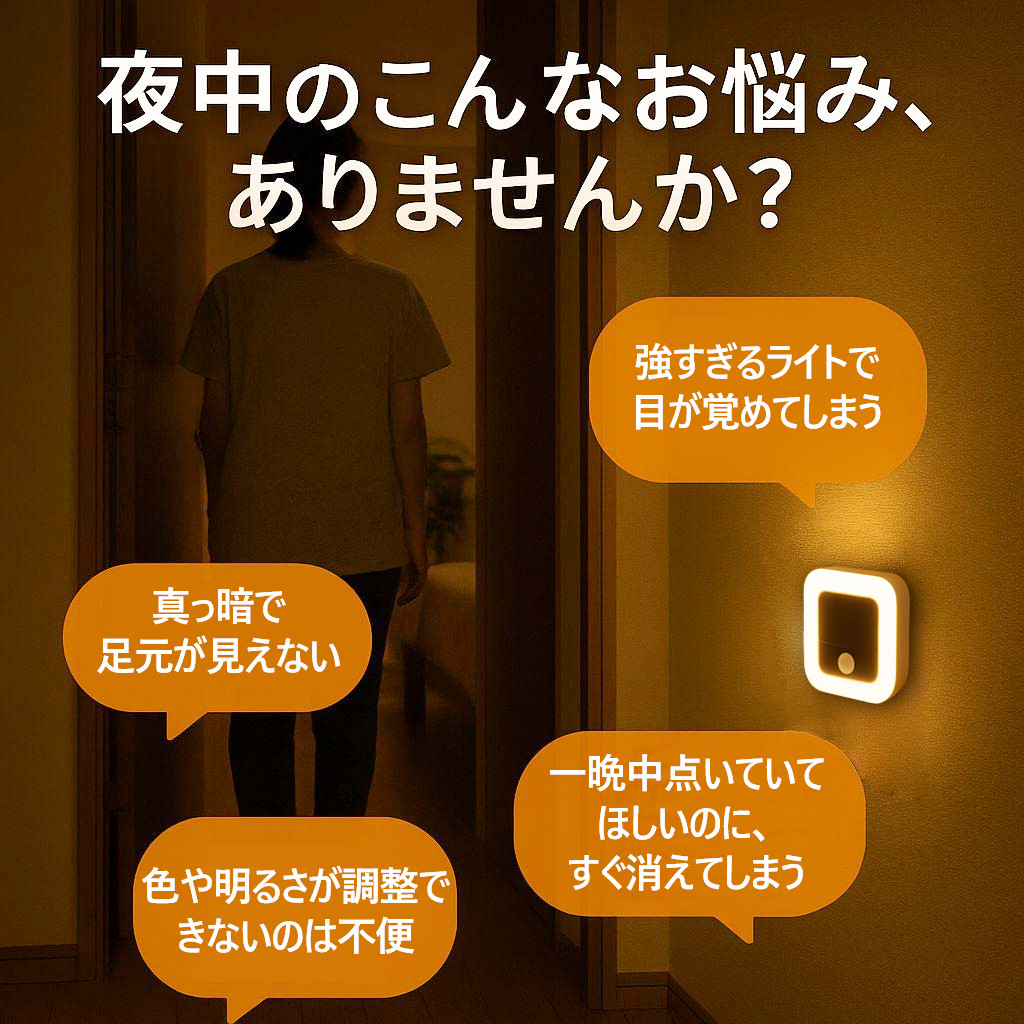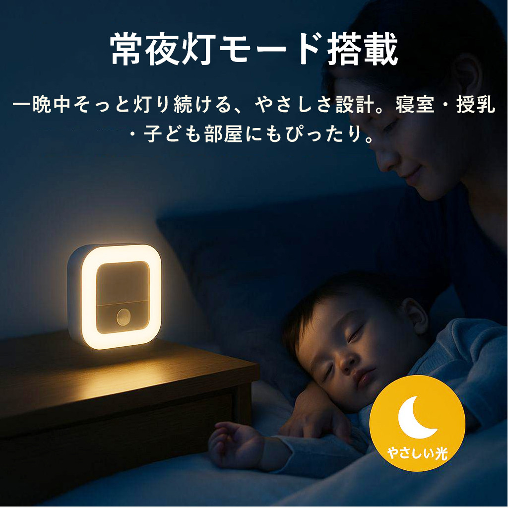 夜中のふとした瞬間、目が覚めても安心できるやさしい灯り。人感センサー搭載で、暗い場所にそっと足を踏み入れると、自動で点灯。お子さまの寝室や、夜間のトイレ、授乳時間にもぴったりな、家族にやさしい光です。