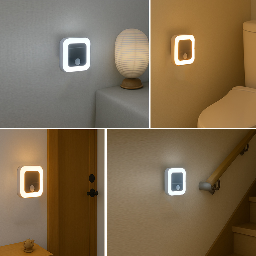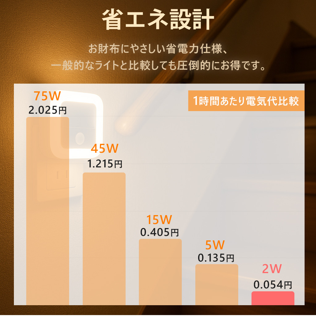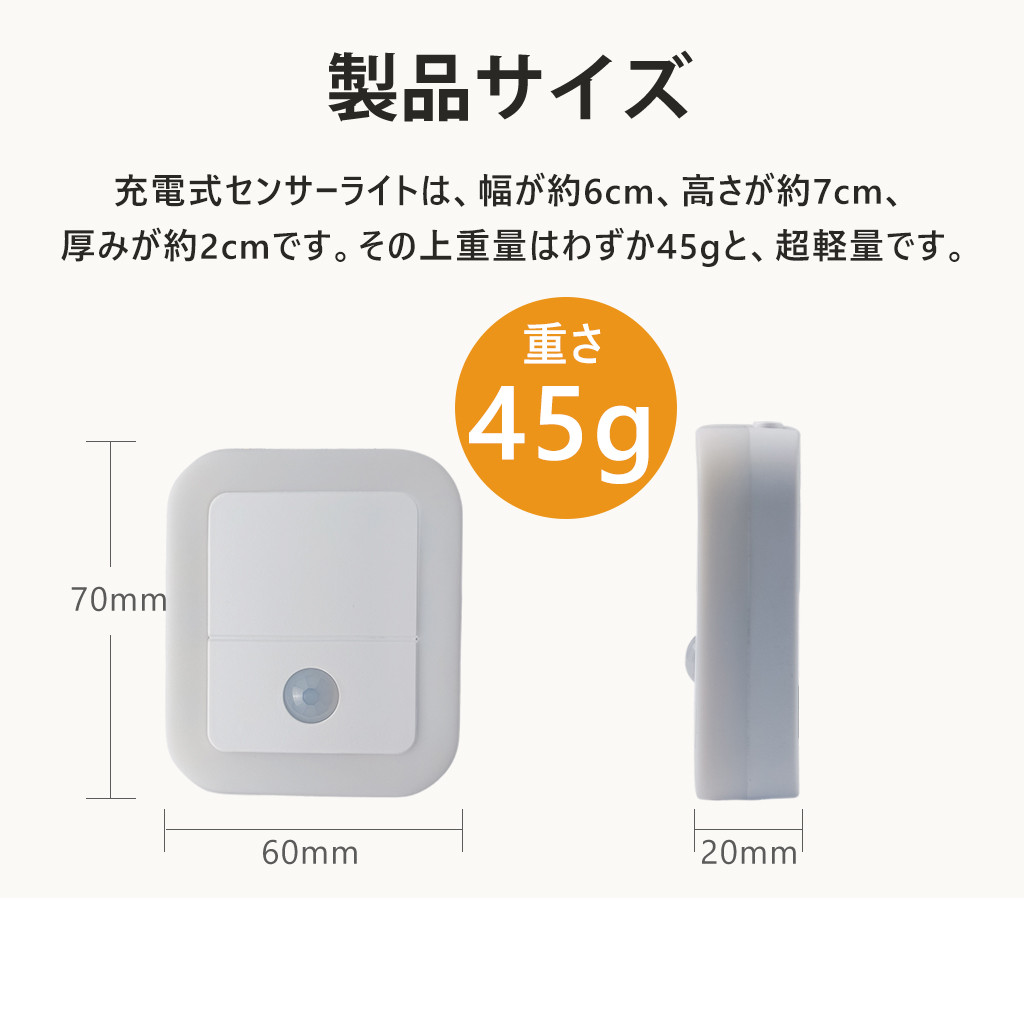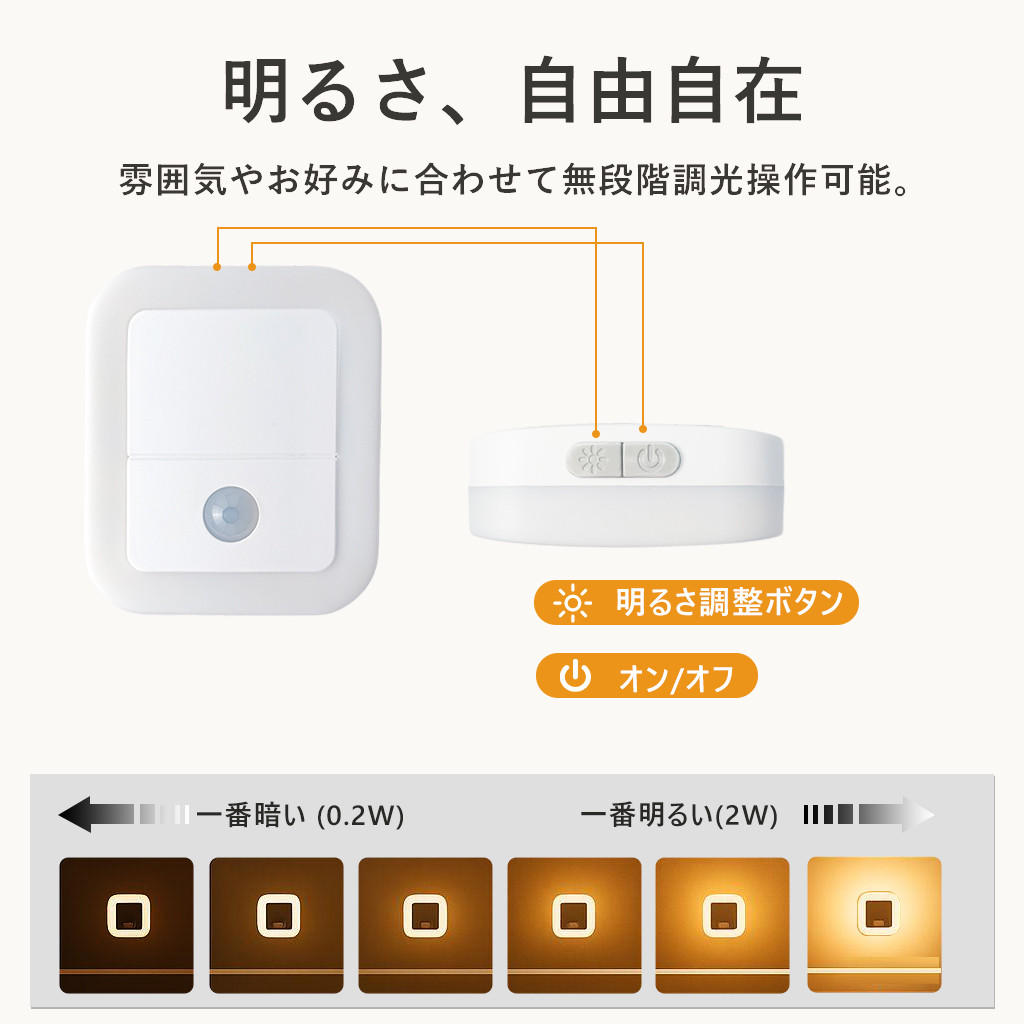 夜中のふとした瞬間、目が覚めても安心できるやさしい灯り。人感センサー搭載で、暗い場所にそっと足を踏み入れると、自動で点灯。お子さまの寝室や、夜間のトイレ、授乳時間にもぴったりな、家族にやさしい光です。