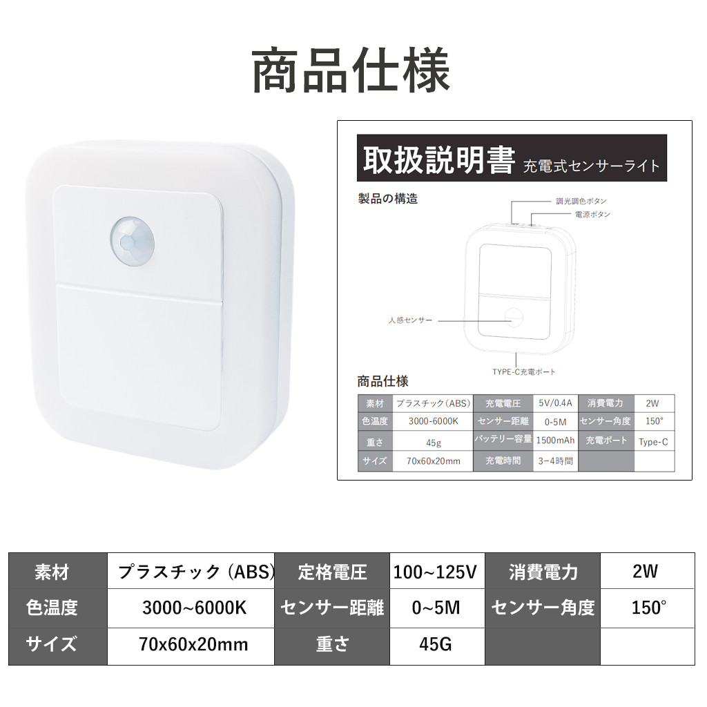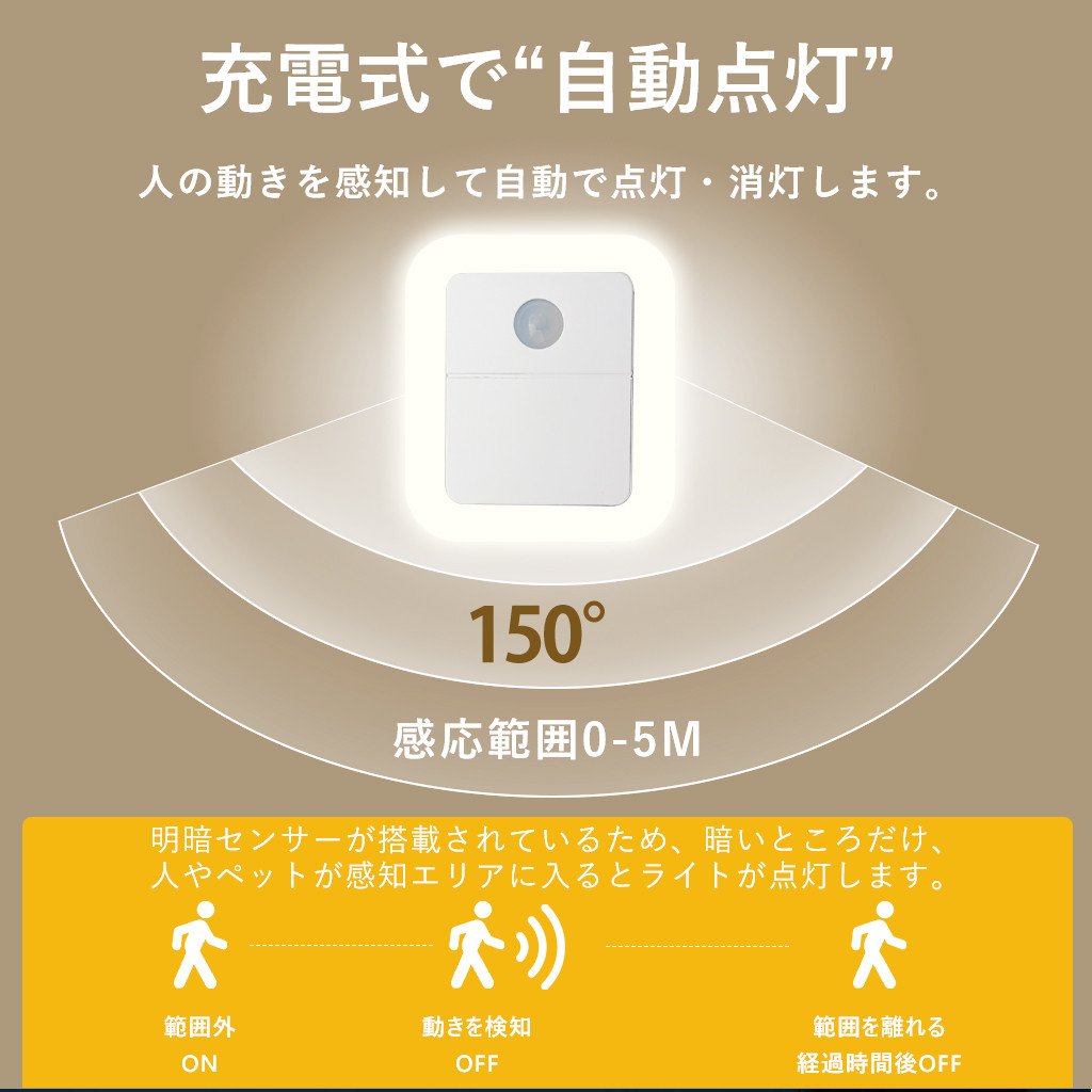 センサーライト LED 人感センサーライト 常夜灯 充電式 室内 小型 足元ライト 調光調色 自動点灯 消灯 省エネ 玄関 廊下 トイレ 階段 明るい おしゃれ