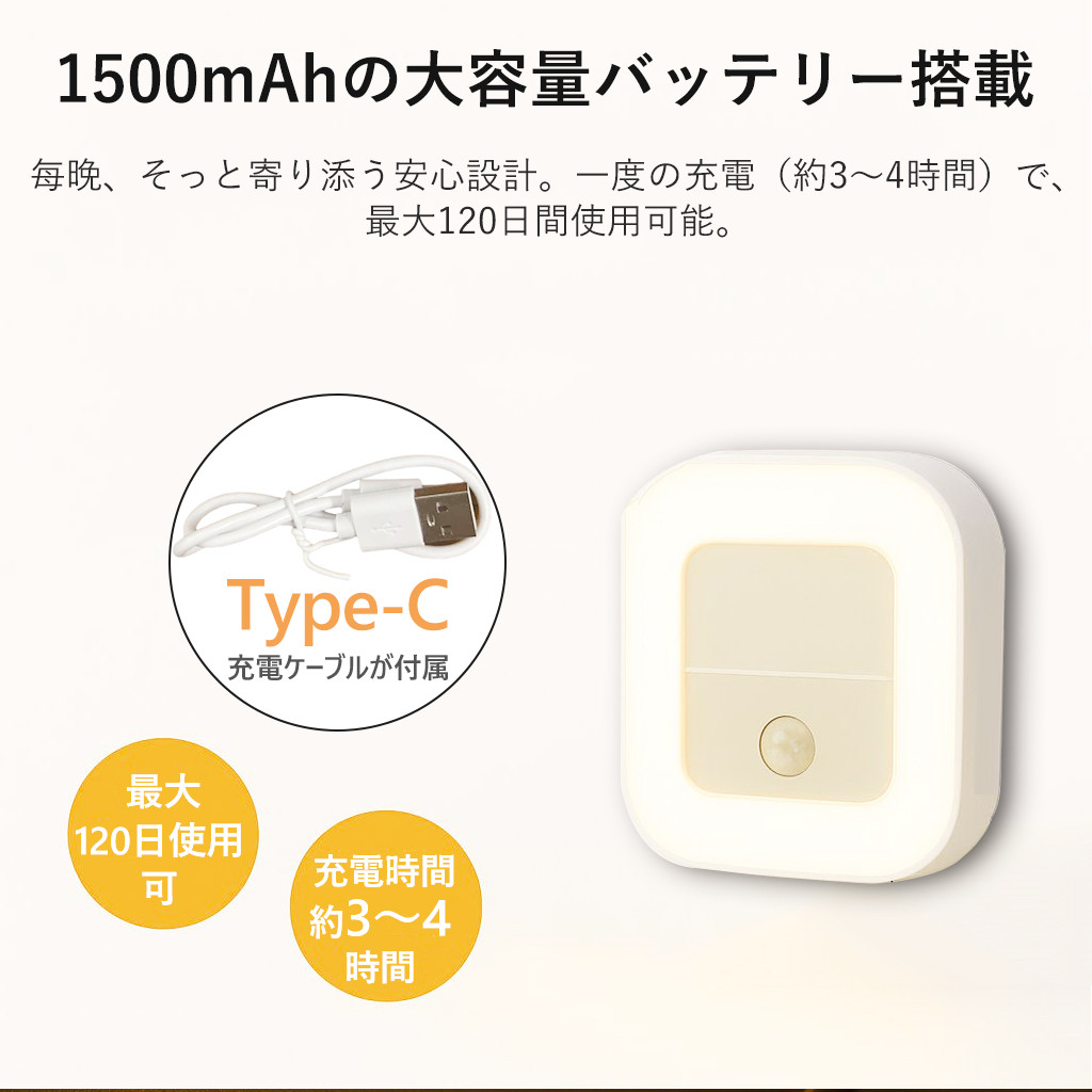 センサーモード中にボタンを押すだけで、常夜灯モードへ切り替え。静かな夜にそっと灯り続ける、あたたかくやさしい光。赤ちゃんのそばで、そっと見守るママにも、夜更かしして仕事を頑張るあなたにも。