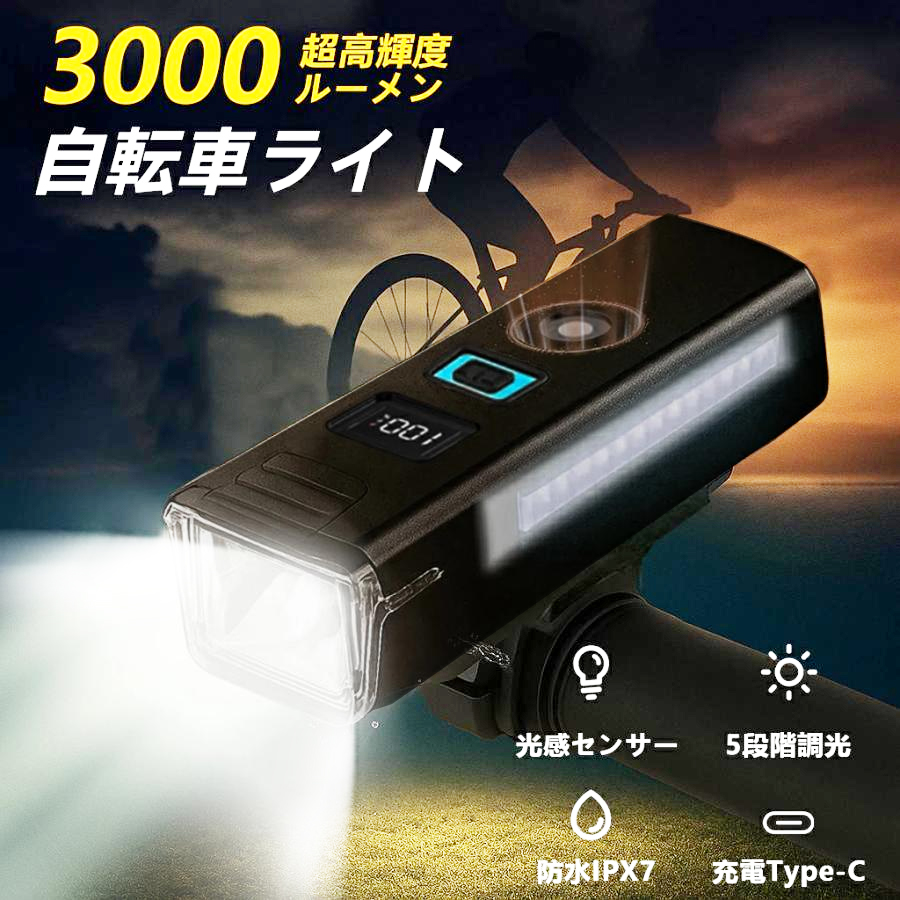 自転車ライト 懐中電灯 LED ledライト 充電式 明るい3000lm 感光センサー 自動点灯 防水 防眩 防塵 残量表示 led 自転車用ライト 小型 子供 通学 通勤