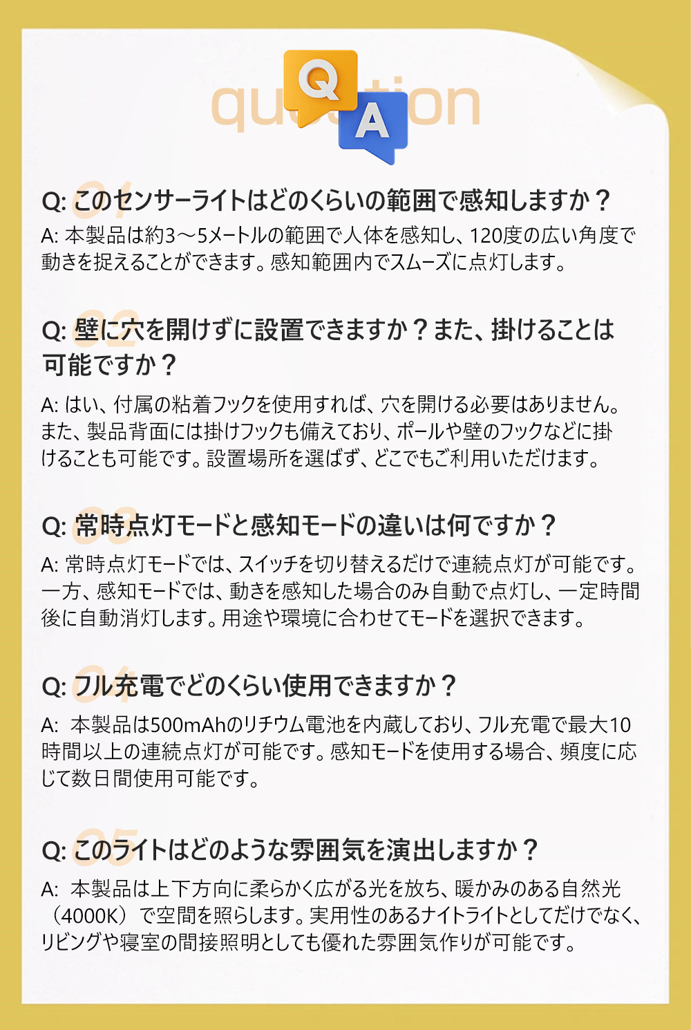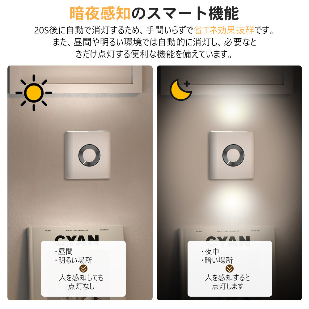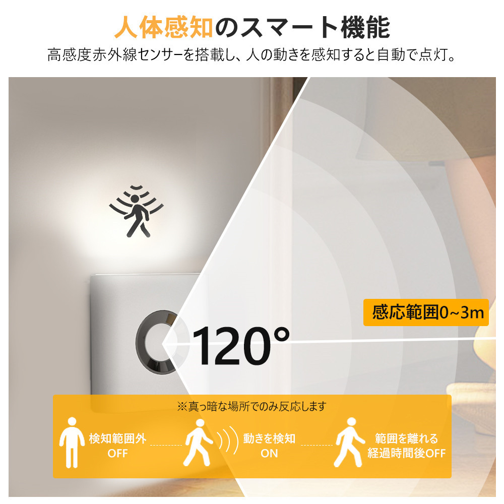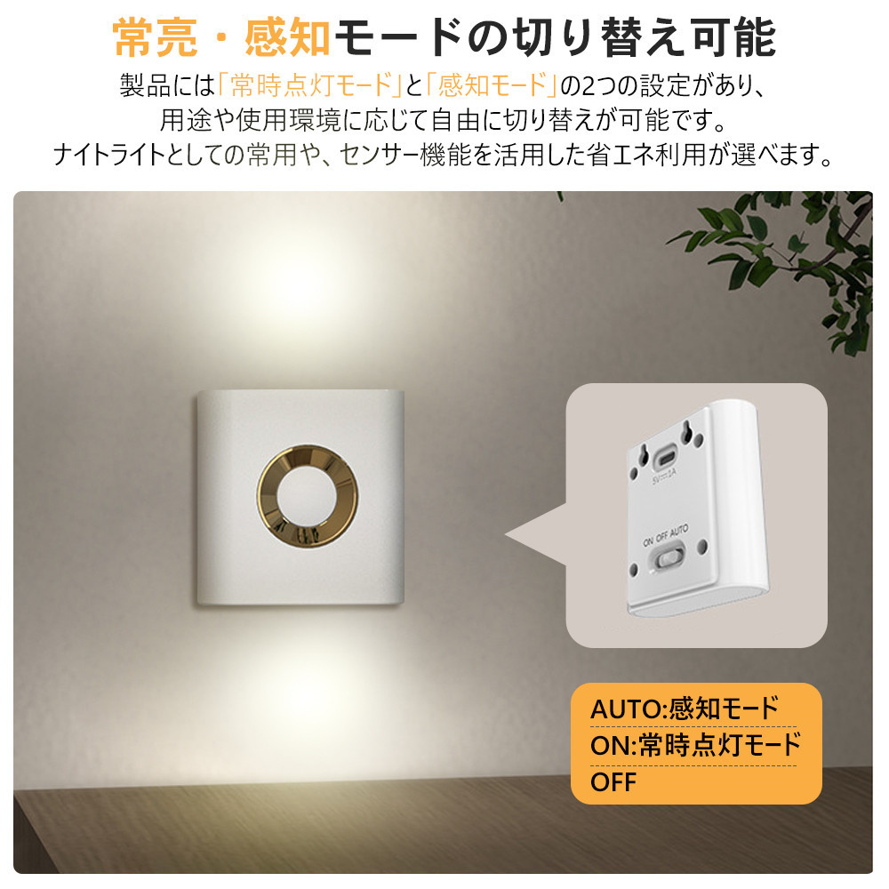 この常夜灯には「常時点灯モード」と「感知モード」の2つの設定があり、用途や使用環境に応じて自由に切り替えが可能です。