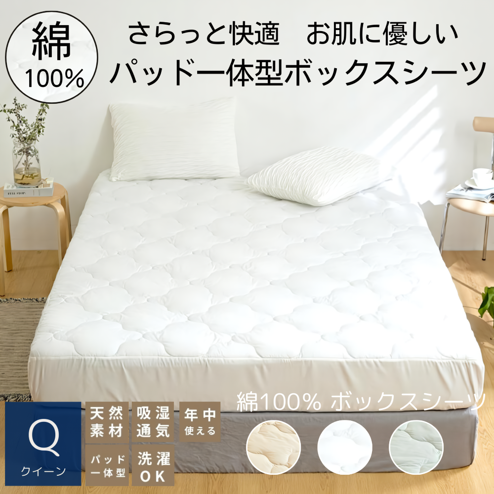 お肌にやさしい、綿100%のさらさらパッド一体型ボックスシーツ。